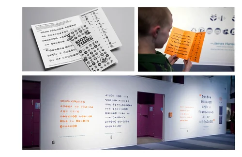 Sign of the Times is an interactive design exhibition located in Imagination Station in downtown Toledo. Imagination Station is a non-profit science center that provides informal education to allow kids to learn in a more fun and involved environment. Sign of the times was a design that allowed kids to decode a message using icons. The theme of the collaboration piece was your ecological carbon footprint. All of the icons were made by individuals in my graphic design class at BGSU and the icon I developed was for the term urbanization. Urbanization is the increase in people that live in urban areas so the icon is depicting the process of tearing down trees so more buildings are able to be built. Shown is the brochure that was passed out during the time the exhibition was up which includes the hidden message allowing kids to learn and have fun in de-coding the phrase. On the wall is a display of the icons and message to allow kids to be able to interact and investigate all of the ins and outs of the carbon footprint.
